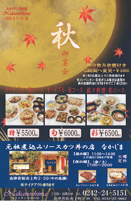 ルネッサンス中の島では、「秋の御宴会プラン」が出来ました。お料理は、オードブル大皿料理と、お料理を銘々に個別に盛ったお料理の、2種類となっております。